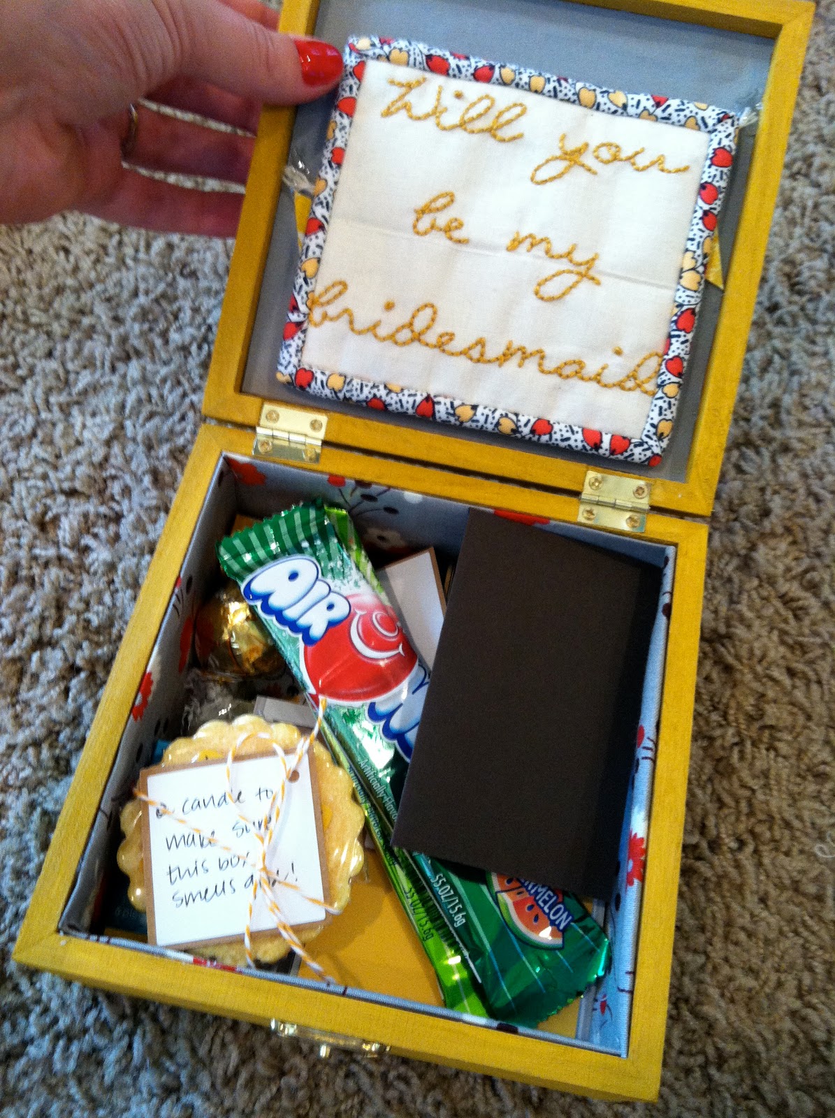 I made small squares that I embroidered with "Will you be my bridesmaid/maid of honor?" and put a binding on them. I filled each box with a few of my favorite things and their favorite things so each box was made for each lady.